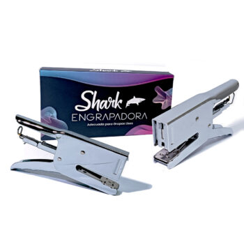 Engrapadora de alicate Shark de color plateado, con un resistente cuerpo de metal. Su diseño tipo alicate permite grapar fácilmente bolsas y etiquetas, así como unificar documentos de hasta 20 hojas.