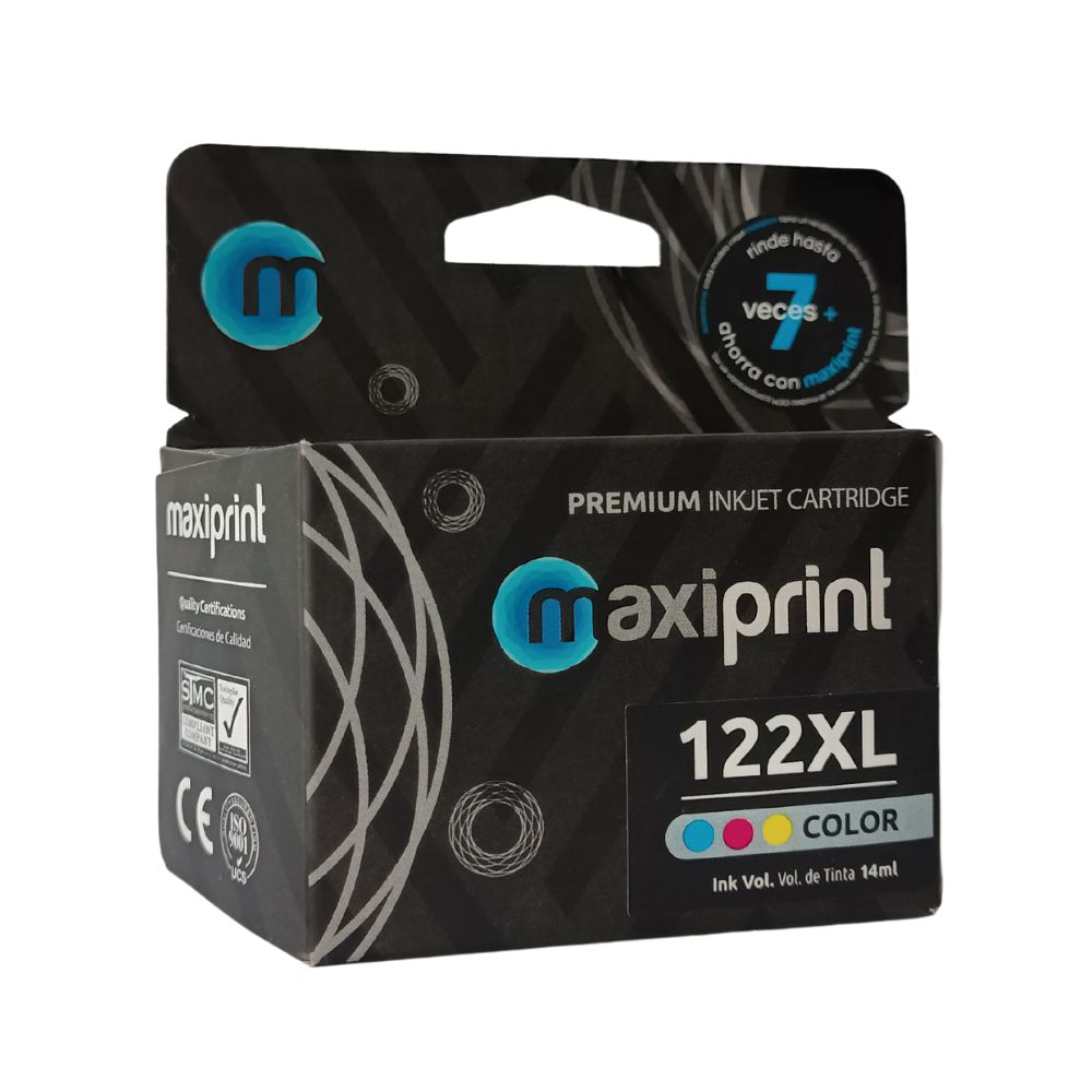 Cartucho 122XL Maxiprint Tricolor CH564HE ,diseñado para reemplazar el cartucho original HP 122XL Tricolor. Es una alternativa más económica a los cartuchos originales, ofreciendo una calidad de impresión comparable a un precio más bajo.